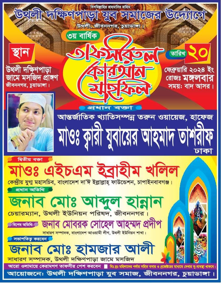 বিষয়টি নিশ্চিত করেছেন উথলী ইউনিয়ন ছাত্রলীগ ও মাহফিল পরিচালনা কমিটির সভাপতি মনিরুল ইসলাম মনি। তিনি বলেন, ‘উথলী দক্ষিণপাড়া যুবসমাজের উদ্যোগে আগামী মঙ্গলবার উথলী দক্ষিণপাড়া জামে মসজিদ সংলগ্ন স্থানে ৩য় বার্ষিক তাফসিরুল কোরআন মাহফিল অনুষ্ঠিত হবে। মাহফিল সুষ্ঠু ও সুন্দরভাবে সম্পন্ন করতে এলাকাবাসীর সার্বিক সহযোগিতা কামনা করছি।’