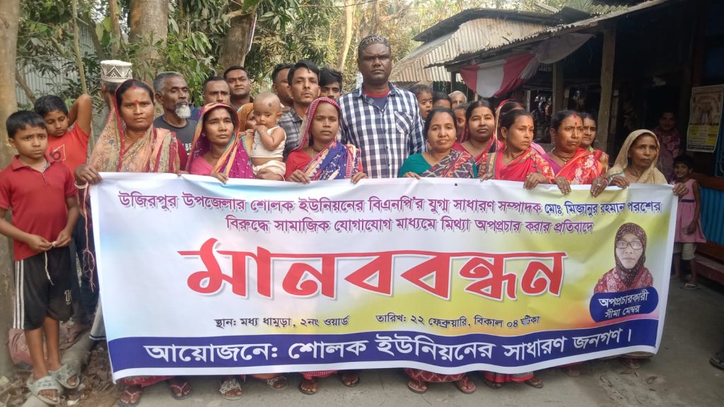 নাজমুল হক মুন্না:: বরিশালের উজিরপুর উপজেলার শোলক ইউনিয়নে বিএনপি নেতার বিরুদ্ধে সামাজিক যোগাযোগমাধ্যমে অপপ্রচারের অভিযোগ তুলে সংরক্ষিত ওয়ার্ডের এক নারী ইউপি সদস্যের বিচারের দাবিতে মানববন্ধন ও বিক্ষোভ মিছিল করেছেন এলাকাবাসী।