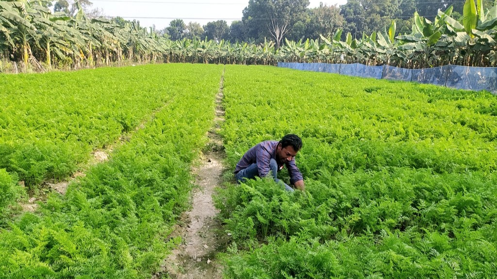পুরো জমি জুড়ে সবুজের সমারোহ। প্রথম দেখাতে অনেকেই বুঝতে পারছেন না এটি আসলে কোন ফসল? ধারণা করছেন ধনেপাতা, কিন্তু না। অন্যকে জিজ্ঞাসা করার পর জানতে পারছেন এটি হচ্ছে গাজর। চুয়াডাঙ্গার জীবননগর উপজেলার উথলী গ্রামের ইউনুছ আলী আড়াই বিঘা জমিতে গাজর চাষ করে এমন অনেককেই তাক লাগিয়ে দিয়েছেন।