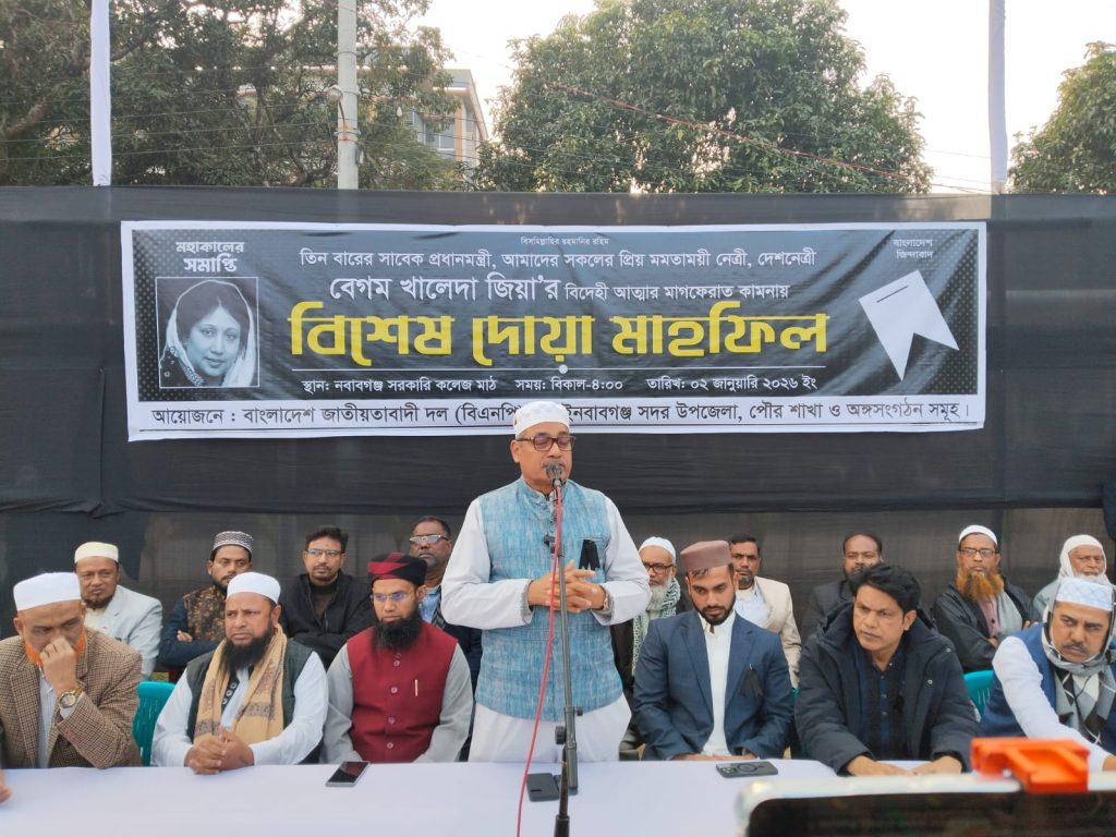 মাহিদুল ইসলাম ফরহাদ, চাঁপাইনবাবগঞ্জ জেলা প্রতিনিধি: বাংলাদেশ জাতীয়তাবাদী দল (বিএনপি) চাঁপাইনবাবগঞ্জ সদর উপজেলা, পৌর শাখা ও অঙ্গসংগঠনের আয়োজনে বেগম খালেদা জিয়ার বিদেহী আত্মার মাগফেরাত কামনায় বিশেষ দোয়া মাহফিল অনুষ্ঠিত হয়েছে। শুক্রবার (২ জানুয়ারি) বিকাল ৪টায় নবাবগঞ্জ সরকারি কলেজ মাঠ প্রাঙ্গণে এ দোয়া মাহফিল অনুষ্ঠিত হয়।