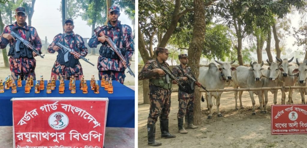 চাঁপাইনবাবগঞ্জ সীমান্তে বিজিবির পৃথক অভিযানে ভারতীয় মদ ও ১১ গরু জব্দ
