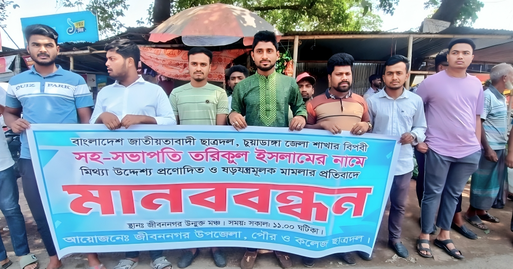 চুয়াডাঙ্গা জেলা ছাত্রদলের সহসভাপতি তরিকুল ইসলামের নামে দায়ের করা মিথ্যা, উদ্দেশ্যপ্রণোদিত ও ষড়যন্ত্রমূলক মামলার প্রতিবাদে মানববন্ধন কর্মসূচি পালন করা হয়েছে। বুধবার (২৬শে মার্চ ২০২৫) দুপুর ১২টার দিকে জীবননগর বাসস্ট্যান্ডে জীবননগর উপজেলা, পৌর ও কলেজ ছাত্রদলের আয়োজনে এই মানববন্ধন কর্মসূচি পালন করা হয়।