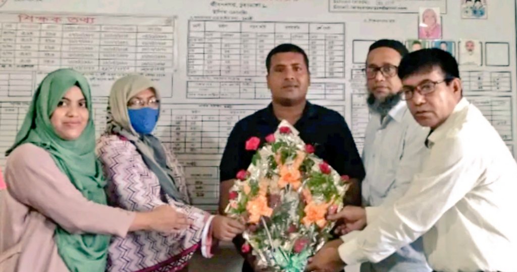 শ্রেষ্ঠ সভাপতি নির্বাচিত হওয়ায় সাংবাদিক এম আই মুকুলকে ফুলেল শুভেচ্ছা জানাচ্ছেন নারায়ণ সরকারি প্রাথমিক বিদ্যালয়ের শিক্ষক-শিক্ষিকামণ্ডলী