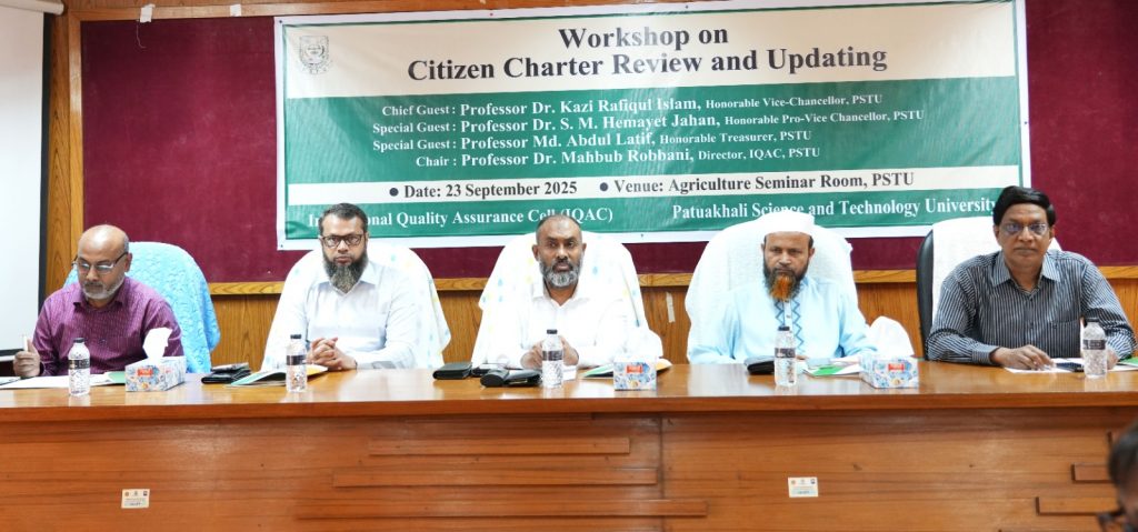 মো: ইউনুছ, দুমকী(পটুয়াখালী)প্রতিনিধিঃ পটুয়াখালী বিজ্ঞান ও প্রযুক্তি বিশ্ববিদ্যালয়ে (পবিপ্রবি) “সিটিজেন চার্টার রিভিউ এন্ড আপডেটিং” শীর্ষক কর্মশালা অনুষ্ঠিত হয়েছে। সোমবার (২৩ সেপ্টেম্বর) সকাল সাড়ে ৯টায় বিশ্ববিদ্যালয়ের এগ্রিকালচার অনুষদের সেমিনার কক্ষে দিনব্যাপী এ কর্মশালা আয়োজন করা হয়।