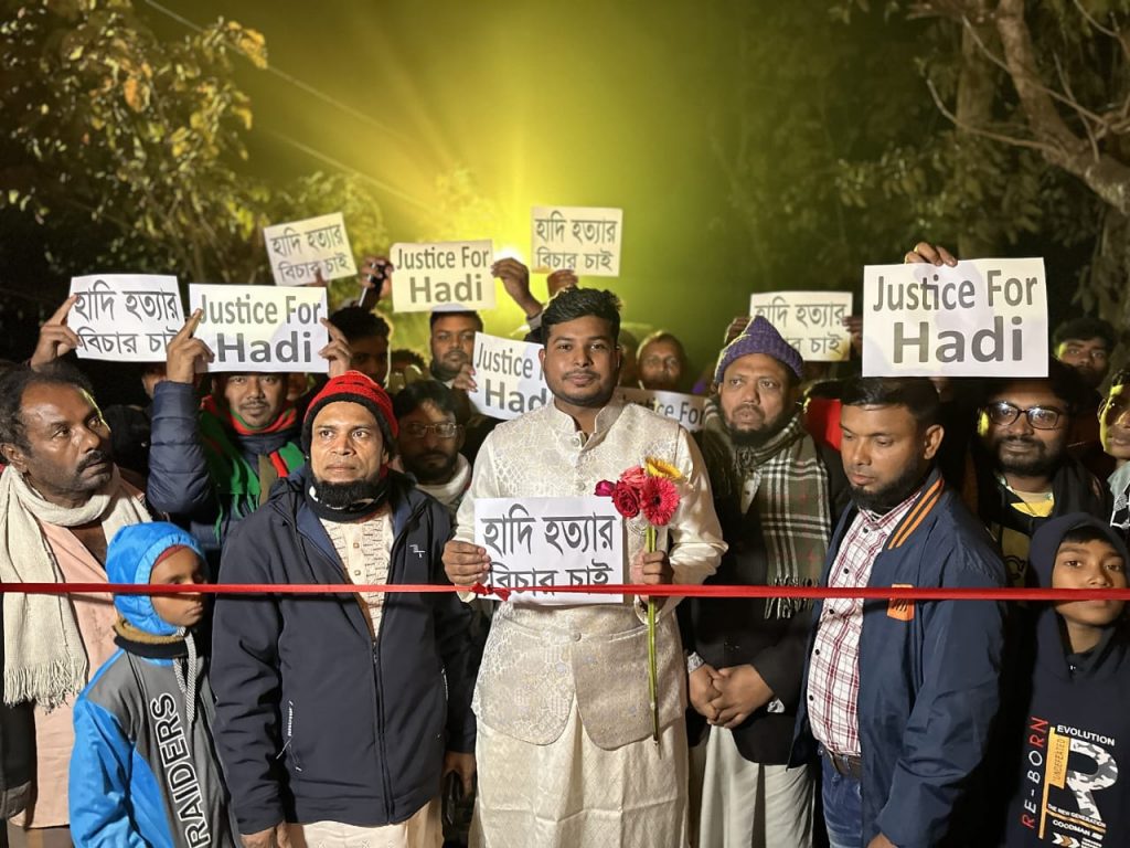 ভুরুঙ্গামারী উপজেলায় গত বুধবার (২৫ ডিসেম্বর) গ্লোবাল টেলিভিশনের রিপোর্টার জাকির হোসেন ও কুড়িগ্রাম সদর উপজেলার পাটেশ্বরী এলাকার মেয়ে নুসরাত জাহান নীলা’র বিয়েতে দেখা যায় ব্যতিক্রমী দৃশ্য। বিয়ের গেইটে নেই চেনা চেঁচামেচি কিংবা দরকষাকষি। বরযাত্রীদের হাতে উঁচু করে ধরা প্ল্যাকার্ডে স্পষ্ট ঘোষণা—‘হাদী হত্যার বিচার চাই’, ‘জাস্টিস ফর হাদী’। এই নীরব দৃঢ়তা সামাজিক যোগাযোগমাধ্যমে ছড়িয়ে পড়লে প্রশংসার জোয়ার ওঠে।