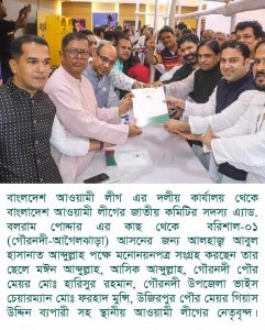 বরিশাল-০১ (গৌরনদী-আগৈলঝাড়া) আসনের জন্য আলহাজ্ব আবুল হাসানাত আব্দুল্লাহ পক্ষে মনোনয়নপত্র সংগ্রহ