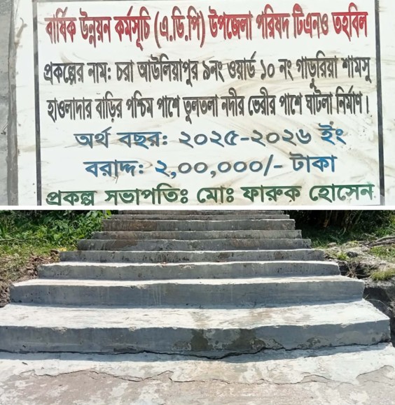 স্থানীয় সূত্রে জানা গেছে, ২০২৫-২০২৬ অর্থ বছরে চরা আউলিয়ারপুর ৯নং ওয়ার্ড ও ১০ নং গারুড়িয়া