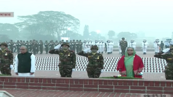 রাষ্ট্রপতি আবদুল হামিদ প্রথমে স্মৃতিসৌধের বেদীতে পুষ্পস্তবক অর্পণ করেন। এরপর প্রধানমন্ত্রী শেখ হাসিনা পুষ্পার্ঘ্য অর্পণ করেন। এসময় রাষ্ট্রপতি ও প্রধানমন্ত্রী মুক্তিযুদ্ধের বীর শহীদদের স্মরণে কিছুক্ষণ নীরবে দাঁড়িয়ে থাকেন। সেনা, নৌ ও বিমান বাহিনীর একটি সুসজ্জিত দল তখন রাষ্ট্রীয় সালাম জানায়। এসময় বিউগলে করুণ সুর বাজানো হয়।