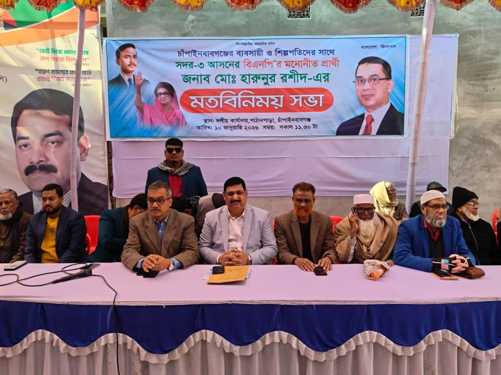 মাহিদুল ইসলাম ফরহাদ, চাঁপাইনবাবগঞ্জ জেলা প্রতিনিধি: চাঁপাইনবাবগঞ্জের ব্যবসায়ী ও শিল্পপতিদের সঙ্গে সদর-৩ আসনের বিএনপির মনোনীত প্রার্থী মোঃ হারুনুর রশীদের মতবিনিময় সভা অনুষ্ঠিত হয়েছে। শনিবার (১০ জানুয়ারি) সকাল সাড়ে ১১টায় শহরের পাঠানপাড়া বিএনপির দলীয় কার্যালয়ের মাঠ প্রাঙ্গণে এ সভা অনুষ্ঠিত হয়। মতবিনিময় সভায় সভাপতিত্ব করেন চাঁপাইনবাবগঞ্জ চেম্বার অব কমার্স অ্যান্ড ইন্ডাস্ট্রির সভাপতি আব্দুল ওয়াহেদ। অনুষ্ঠানটি সঞ্চালনা করেন শাহনেওয়াজ খাঁন সিনা।
