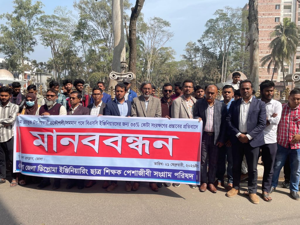 ভোলায় দশম গ্রেড ভূক্ত উপ-সহকারী প্রকৌশলী সমমান পদে বিএসসি ইঞ্জিনিয়ারদের জন্য ৩৩% কোটা সংরক্ষণের প্রস্তাবের প্রতিবাদে মানববন্ধন করা হয়েছিল। আজ রবিবার ভোলা প্রেসক্লাবের সামনে জেলা ডিপ্লোমা ইঞ্জিনিয়ারিং ছাত্র-শিক্ষক পেশাজীবী সংগ্রাম পরিষদের আয়োজনে ঘন্টা ব্যাপী এ মানববন্ধন ও বিক্ষোভ মিছিল করা হয়েছে। এ সময় বক্তারা দ্রুত সময়ের মধ্যে তাদের দাবি কৃত ৩৩% কোটা সংরক্ষণ বাতিলের জন্য কার্যকরী ব্যবস্থা নেয়ার দাবী জানান। অন্যথায় কঠোর আন্দোলনের হুঁশিয়ারি দেন বক্তারা।