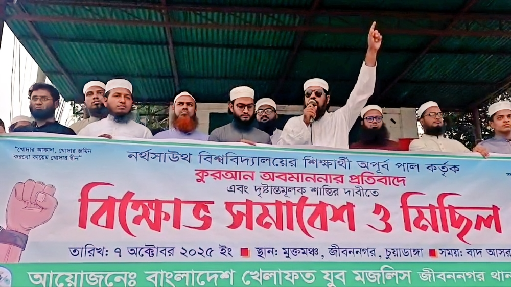 নর্থ সাউথ ইউনিভার্সিটির শিক্ষার্থী অপূর্ব পাল কর্তৃক মহাগ্রন্থ আল কুরআন অবমাননার প্রতিবাদ ও অবমাননাকারীর দৃষ্টান্তমূলক শাস্তির দাবিতে চুয়াডাঙ্গার জীবননগরে বিক্ষোভ সমাবেশ ও মিছিল অনুষ্ঠিত হয়েছে।