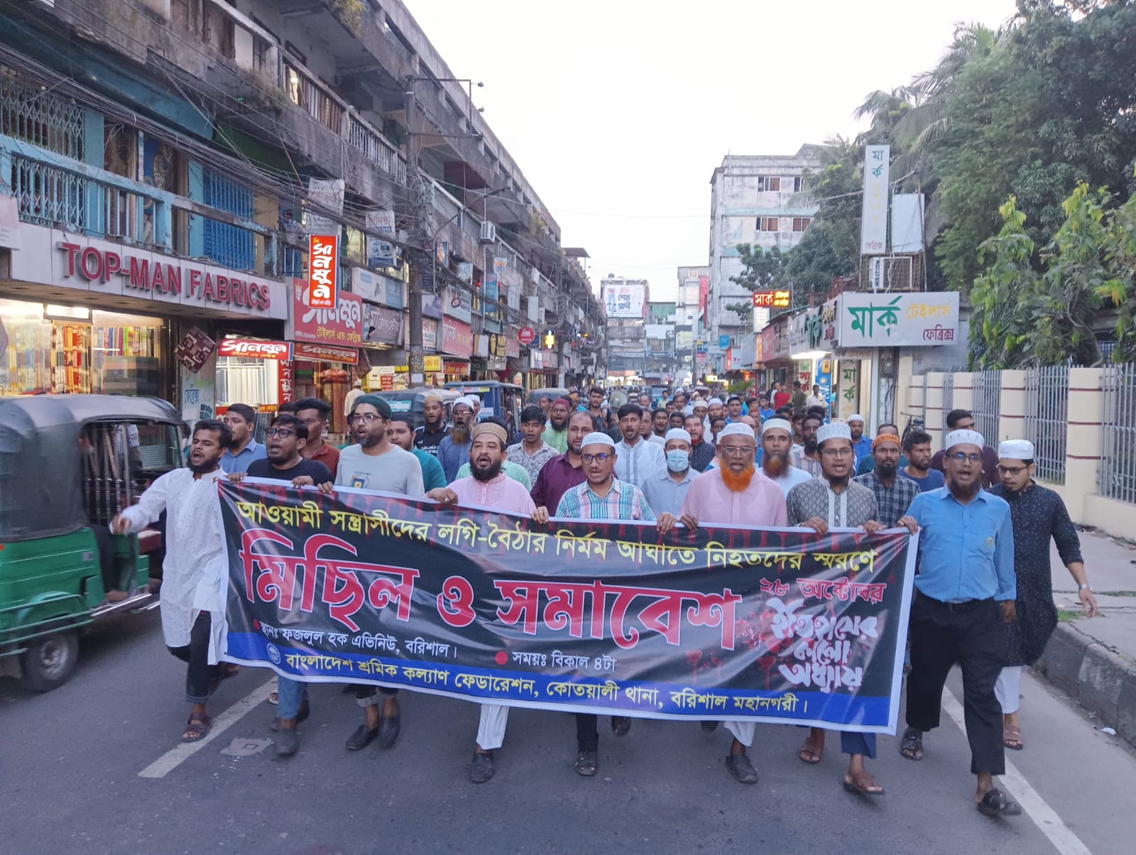 আপডেট নিউজ : ২০০৬ সালের ২৮ অক্টোবর ঢাকাসহ সারাদেশে তান্ডব ও নৃশংস গণহত্যার প্রতিবাদ এবং গণহত্যায় জড়িত আওয়ামী সন্ত্রাসীদের গ্রেপ্তার করে বিচারের দাবিতে বাংলাদেশ জামায়াতে ইসলামী বরিশাল মহানগর শাখা কর্তৃক আয়োজিত বিক্ষোভ মিছিলে অংশ নিয়েছে বাংলাদেশ শ্রমিক কল্যাণ ফেডারেশন কোতয়ালী থানা শাখা। মঙ্গলবার বিকেলে নগরীর চাঁদমারী থেকে বিশাল এক মিছিল বান্দরোড, সদর রোড হয়ে ফজলুল হক এভিনিউতে সমাবেশস্থলে যায়। এতে নেতৃত্ব দেন শ্রমিক কল্যাণ ফেডারেশন কোতয়ালী থানা সভাপতি মাহমুদুল হাসান কামাল, পেশাজীবী থানার নায়েবে আমির মাওলানা ওলিউর রহমান, শ্রমিক কল্যাণ কোতয়ালী থানা শাখার সহ সভাপতি মাহাদী হোসাইন ও আবু জাফর, থানা সেক্রেটারি সেলিম হাওলাদার, বিশিষ্ট ইসলামী ব্যক্তিত্ব মুহম্মদ আব্দুল কুদ্দুস, পেশাজীবী ওয়ার্ডের সেক্রেটারি আনোয়ার হোসেন সহ অন্যান্য নেতৃবৃন্দ।