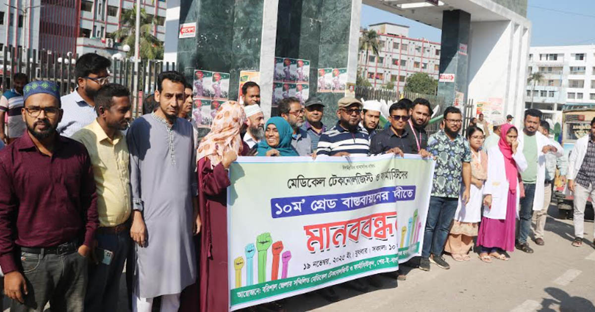 বুধবার দুপুর ২টায় বরিশাল শের-ই-বাংলা মেডিকেল কলেজ হাসপাতালের সামনে এই মানববন্ধন কর্মসূচী পালন করা হয়।জানাগেছে, দীর্ঘদিন ধরে বেতন বৈষম্যের শিকার হয়ে আসছেন মেডিকেল টেকনোলজিস্ট ও ফার্মাসিস্টরা। অথচ তারা স্বাস্থ্যসেবা নিশ্চিত করতে গুরুত্বপূর্ণ অংশ হিসেবে কাজ করে যাচ্ছেন। দেশের করোনা, ডেঙ্গু, নিপাহ ভাইরাসসহ নানা স্বাস্থ্যঝুঁকিতে জীবন বাজি রেখে কাজ করলেও তারা ন্যায্য গ্রেড থেকে বঞ্চিত হওয়ার অভিযোগ করেছেন।মানববন্ধন কর্মসূচীতে অংশগ্রহণকারী মেডিকেল ফার্মাসিস্ট মো. সাইফুল ইসলাম লিটন বলেন, “দেশের অন্যান্য ডিপ্লোমাধারী কর্মকর্তাদের দ্বিতীয় শ্রেণীতে উন্নীত করা হলেও মেডিকেল টেকনোলজিস্ট ও ফার্মাসিস্টদের ক্ষেত্রে এখনো বৈষম্য রয়ে গেছে। সারাদেশে ল্যাব টেকনোলজিস্ট ও ফার্মাসিস্টরা স্বাস্থ্যব্যবস্থায় গুরুত্বপূর্ণ অবদান রাখলেও বারবার তাদের দাবি অবহেলিত হচ্ছে। তাই আমাদের দশম গ্রেড বাস্তবায়ন চাই। দ্রুত সময়ের মধ্যে দশম গ্রেড বাস্তবায়ন না হলে আমরা কর্মবিরতি ও আরও কঠোর কর্মসূচিতে যেতে বাধ্য হব।”