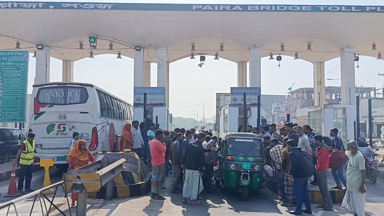 জাকির দুমকি (পটুয়াখালী) প্রতিনিধি:: পটুয়াখালী জেলার দুমকি উপজেলায়, লেবুখালী পায়রা সেতুর টোল প্লাজায় বাসের ধাক্কায় টোলকর্মী সহিদুল ইসলাম (৪০) গুরুতর আহত হয়েছেন। বুধবার সকাল সাড়ে ১১টার দিকে ঢাকা-বাউফলগামী সাকুরা পরিবহন (ঢাকা মেট্রো-ব-১২-২৩০৩) তাকে ধাক্কা দেয়।প্রত্যক্ষদর্শীরা জানান, টোল প্লাজায় দায়িত্ব পালনকালে দাঁড়িয়ে থাকা সহিদুল ইসলামকে বাসটি ধাক্কা দিলে তিনি ছিটকে আইল্যান্ডের ওপর পড়ে যান।