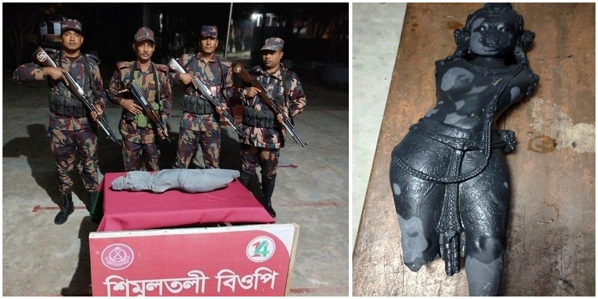 বুধবার (২৪ ডিসেম্বর) ১৪ বিজিবির অধিনায়ক লে. কর্নেল মো. আব্দুল্লাহ আল মামুন জানান, সীমান্ত এলাকার নলপুকুর বুড়োল দিঘীতে স্থানীয়রা দিঘী খননের সময় একটি দুষ্প্রাপ্য কষ্টি পাথরের মূর্তি দেখতে পায়। পরে খবর পেয়ে শিমুলতলী বিওপি কমান্ডার সুবেদার মো. তহুরুল ইসলামের নেতৃত্বে ৬ সদস্যের একটি বিশেষ টহল দল স্থানীয় জনগণের সহযোগিতায় ওই পুকুর থেকে ২৭ দশমিক ৫৮০ কেজির মূর্তিটি উদ্ধার করে। পরবর্তীতে উদ্ধার মূর্তিটি স্বর্ণকারের মাধ্যমে নাইট্রিক অ্যাসিড ও পরীক্ষার মাধ্যমে যাচাই করা হয়। পরীক্ষায় এটি অত্যন্ত উচ্চমানের দুষ্প্রাপ্য কষ্টি পাথরের মূর্তি বলে প্রতীয়মান হয় এবং জুয়েলারি অভিজ্ঞদের মতে এর মূল্য প্রায় ১৫ কোটি টাকারও বেশি।
